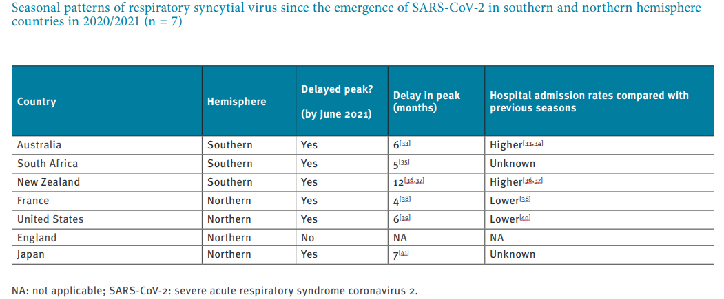 2.Williams TC, Sinha I, Barr IG, Zambon M. Transmission of paediatric respiratory syncytial virus and influenza in the wake of the COVID-19 pandemic. Euro Surveill. 2021 Jul;26(29):2100186.