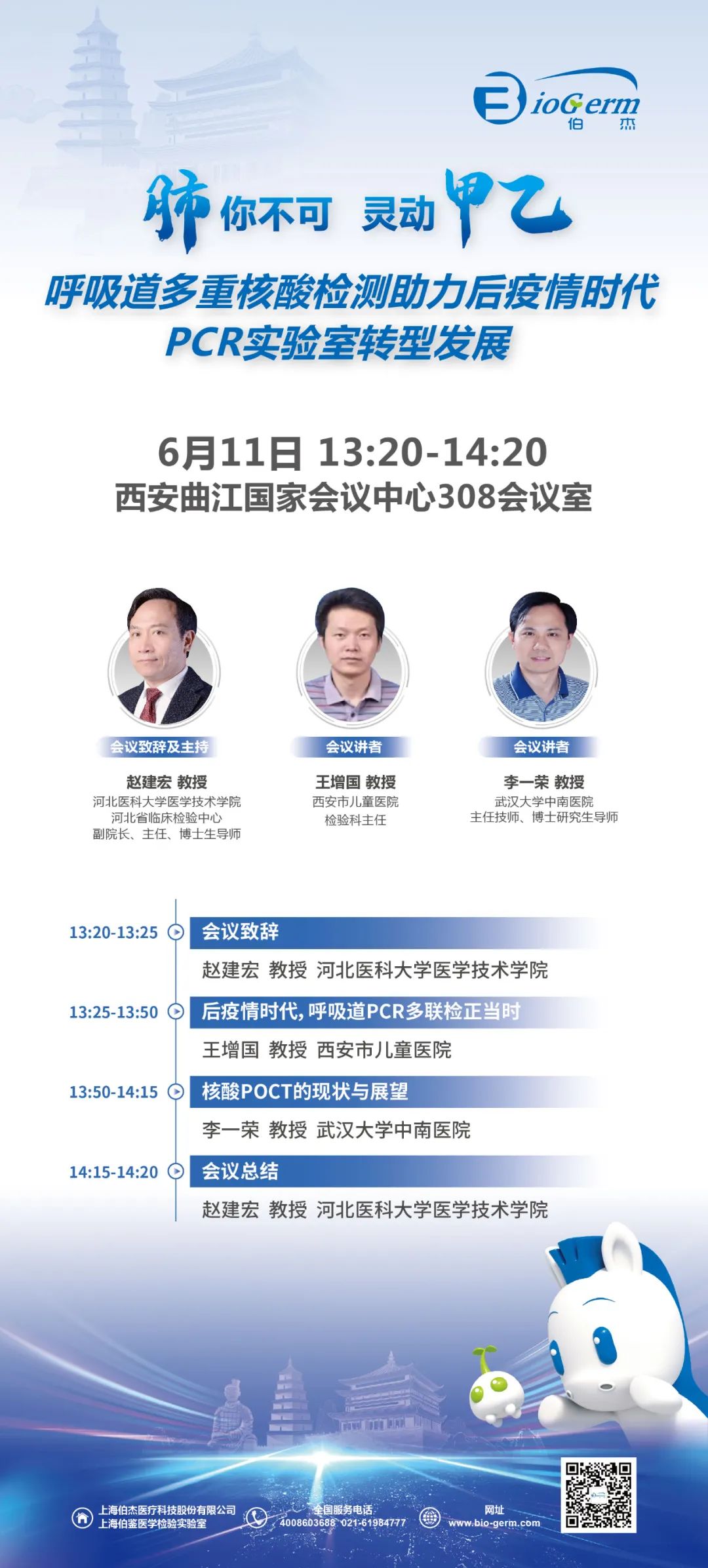 6月11日13:20-14:20,伯杰醫(yī)療將以“「肺」你不可,靈動「甲乙」”為主題開展“呼吸道多重核酸檢測助力后疫情時代PCR實驗室轉(zhuǎn)型發(fā)展 ”學(xué)術(shù)會,與臨床檢驗專家共同探討PCR實驗室轉(zhuǎn)型發(fā)展新方向。