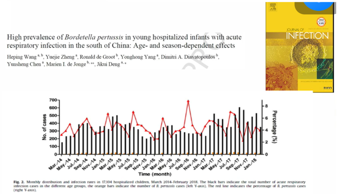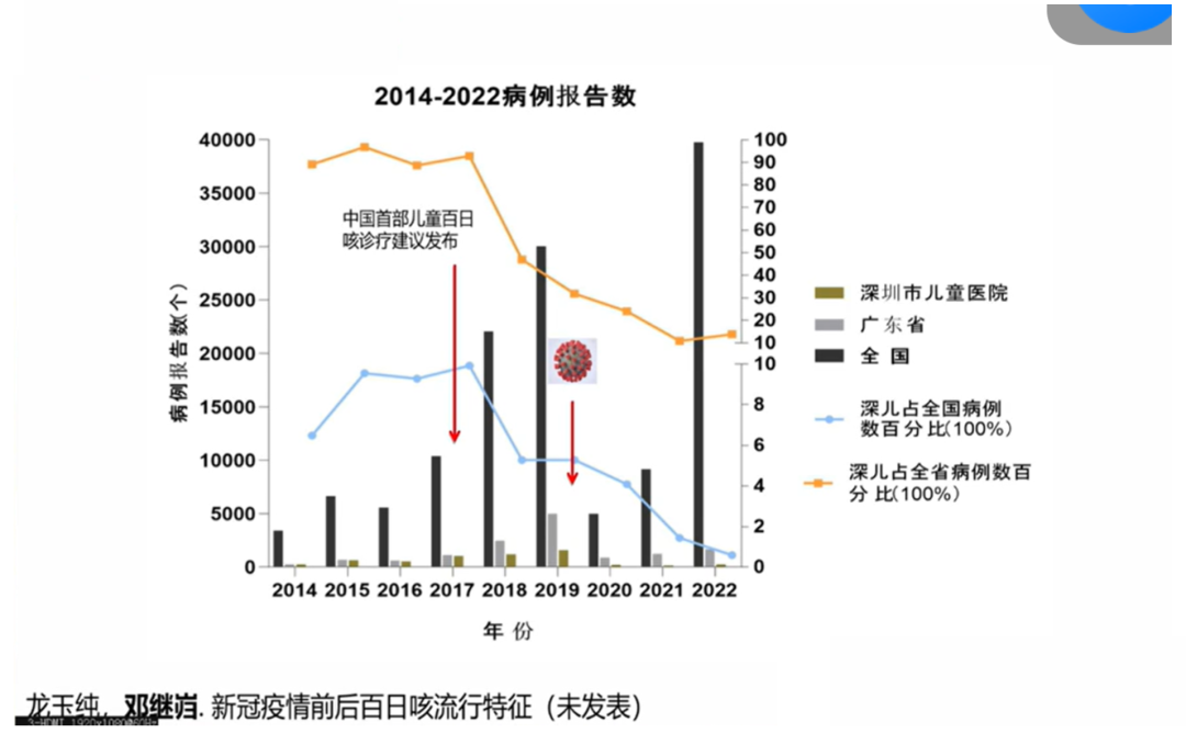 從2014到2022整個(gè)百日咳病例變化的情況,2019年報(bào)告了30000多例百日咳病例。新冠來了以后病例數(shù)下降,但在2022年又出現(xiàn)增高的趨勢(shì)。很多醫(yī)院還沒有開展百日咳檢測(cè),這一部分百日咳病例數(shù)可能只是冰山一角。