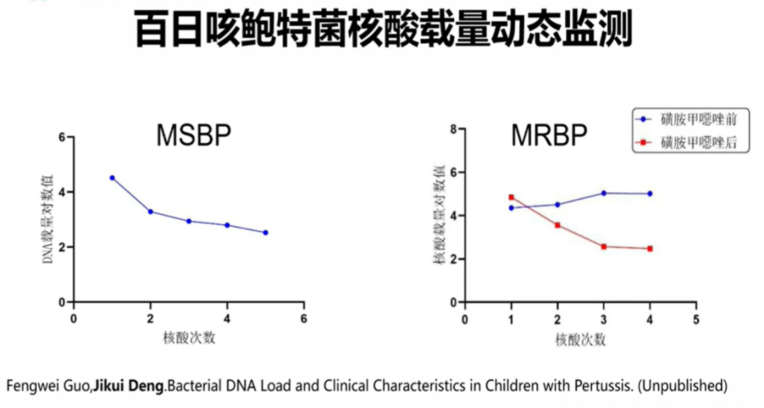 對(duì)于大環(huán)內(nèi)酯類藥敏感的百日咳鮑特菌,用大環(huán)內(nèi)酯類藥治療就會(huì)很清楚的看到,臨床癥狀逐步好轉(zhuǎn),咳嗽逐步減輕,核酸載量呈現(xiàn)逐步下降。但對(duì)于耐大環(huán)內(nèi)酯類百日咳鮑特菌的治療,用大環(huán)內(nèi)酯類的抗菌藥物治療,核酸載量仍會(huì)往上攀升,說明治療是無(wú)效的,而且患者的癥狀沒有改善,因此就要考慮及時(shí)的換用二線的磺胺來進(jìn)行治療,用藥后很快看到患者癥狀在好轉(zhuǎn),而且核酸載量也開始逐步下降。目前很多醫(yī)院做不了這個(gè)百日咳鮑特菌的培養(yǎng)和藥敏,而核酸檢測(cè)是很好的檢測(cè)方式,做好動(dòng)態(tài)的監(jiān)測(cè)能夠給臨床提供足夠的信息支持來進(jìn)行抗菌藥物及時(shí)的調(diào)整。