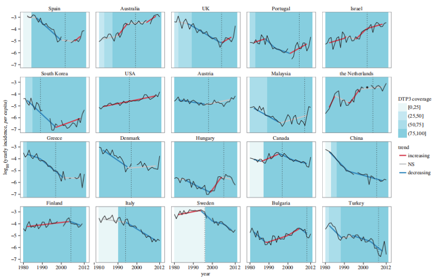 1980-2012年使用百日咳疫苗進(jìn)行初級免疫的20個國家的年發(fā)病率數(shù)據(jù)