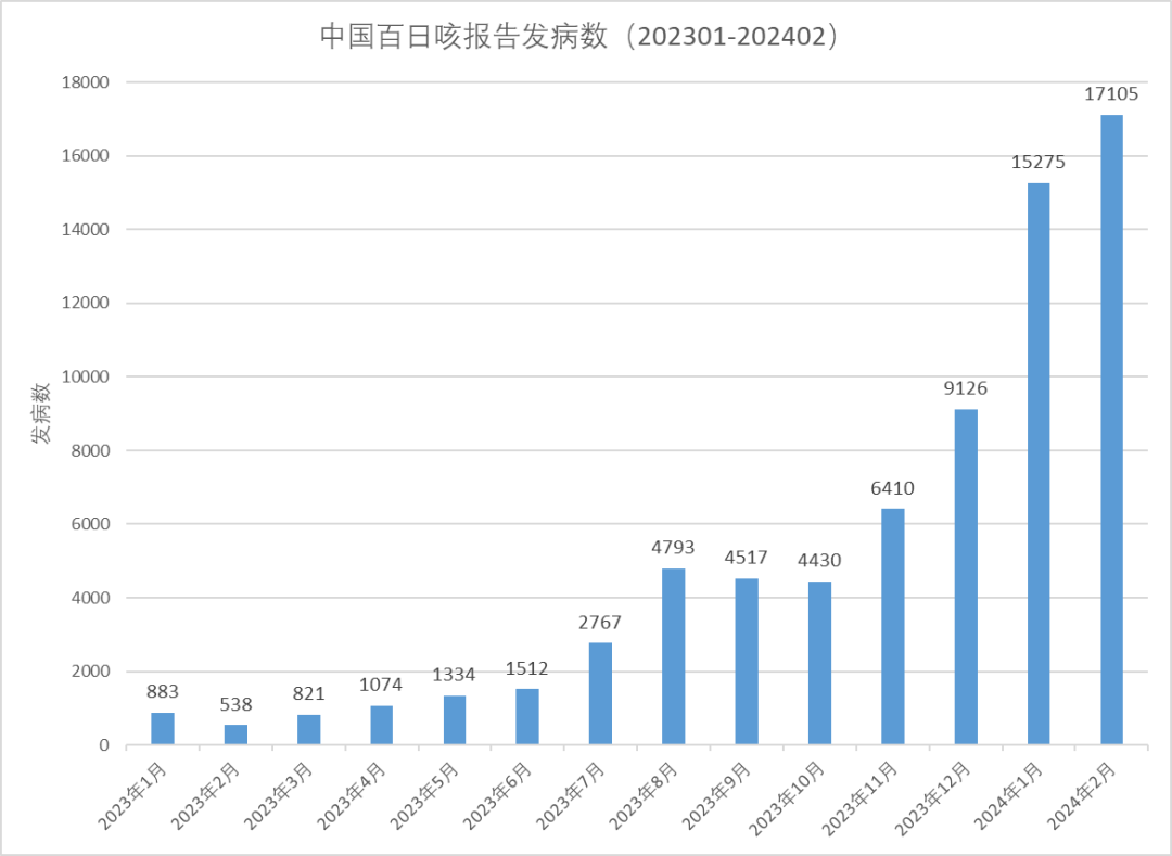 中國CDC數(shù)據(jù)也顯示,自2023年3月以來,百日咳的發(fā)病數(shù)開始上升,在2024年2月份,百日咳的發(fā)病數(shù)為17105,是2023年2月份的近32倍!