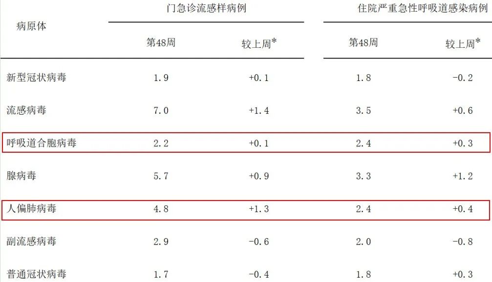 第48周數(shù)據(jù)顯示,門急診偏肺病毒陽性率達4.8%,而呼吸道合胞病毒(RSV)陽性率為2.2%;HMPV較前一周上升1.3%,顯著高于RSV的0.1%增幅率。
