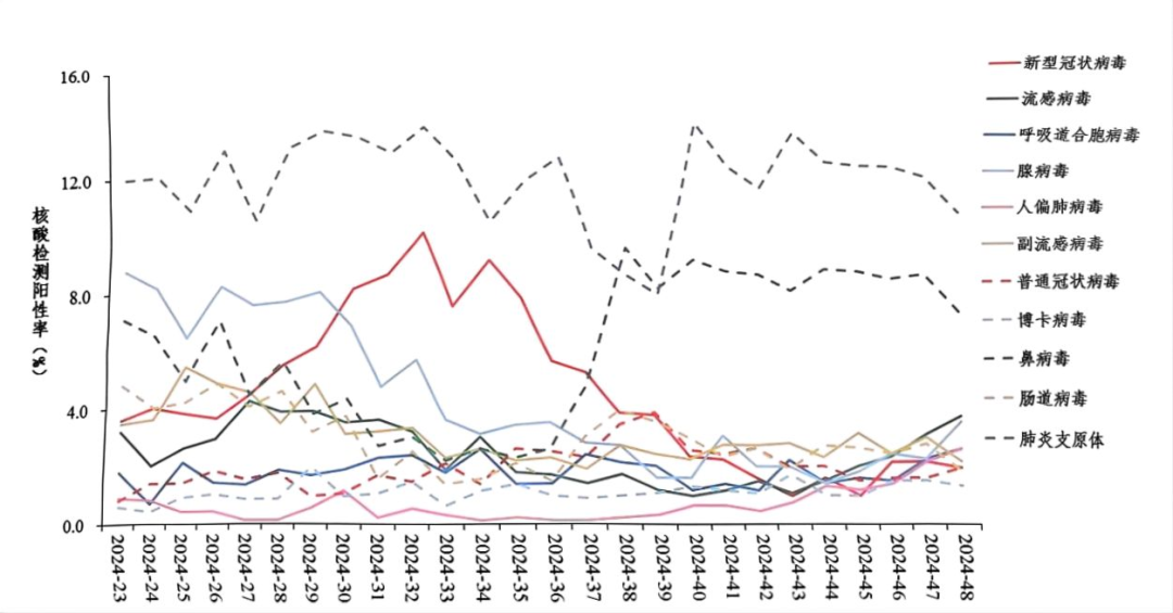 圖2:哨點醫(yī)院住院嚴重急性呼吸道感染病例呼吸道樣本病原體核酸檢測陽性率每周變化趨勢