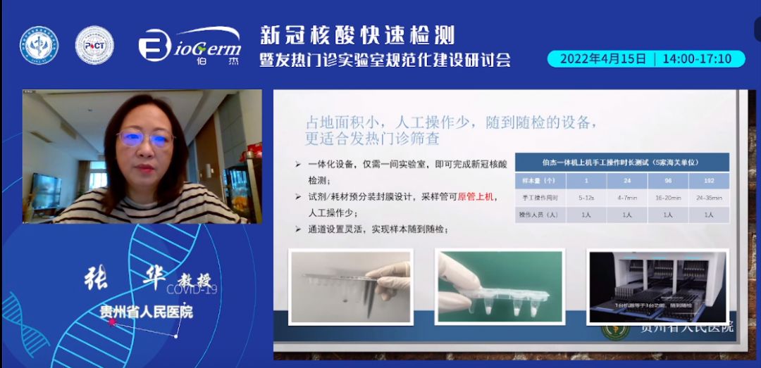 貴州省已在2020年7月21日頒布了《貴州省發(fā)熱門診設置指南》,指南規(guī)定發(fā)熱門診納入醫(yī)院建設總體規(guī)劃,嚴格按照三區(qū)兩通道設置,目前已建設183家發(fā)熱門診。張華教授指出以伯杰一體機為例,對于發(fā)熱門診來說,占地面積小,人工操作少、隨到隨檢的設備更適合發(fā)熱門診篩查。
