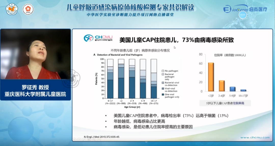 羅征秀教授介紹,兒童呼吸道感染的病原學(xué):不同年齡感染的病原種類有差異,國內(nèi)外的研究數(shù)據(jù)顯示病毒是呼吸道感染最重要的病原。其中呼吸道合胞病毒,副流感病毒,流感病毒等在住院急性下呼吸道感染患者中的檢出比例較高。