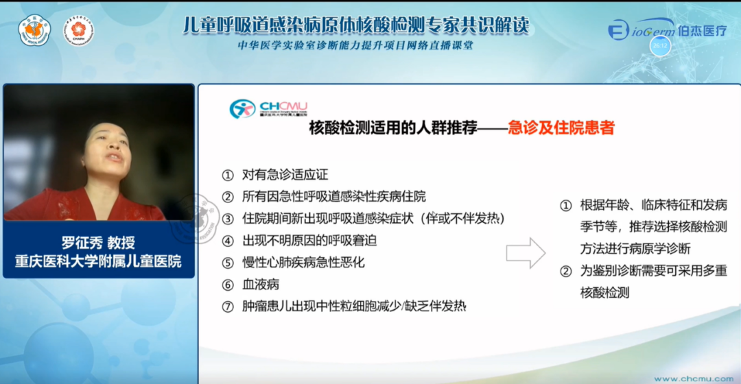 對有急診適應(yīng)證及所有因急性呼吸道感染性疾病住院、住院期間新出現(xiàn)呼吸道感染癥狀(伴或不伴發(fā)熱)、或出現(xiàn)不明原因的呼吸窘迫、慢性心肺疾病急性惡化、血液病、腫瘤患兒出現(xiàn)中性粒細(xì)胞減少/缺乏伴發(fā)熱的,應(yīng)根據(jù)年齡、臨床特征和發(fā)病季節(jié)等,推薦選擇核酸檢測方法進(jìn)行病原學(xué)診斷,為鑒別診斷需要可采用多重核酸檢測。
