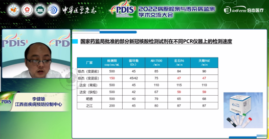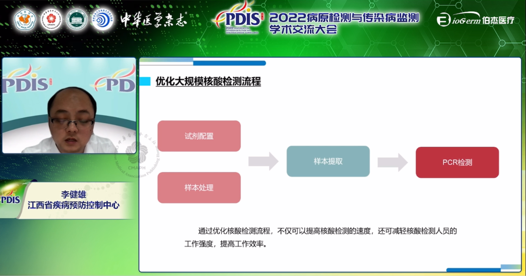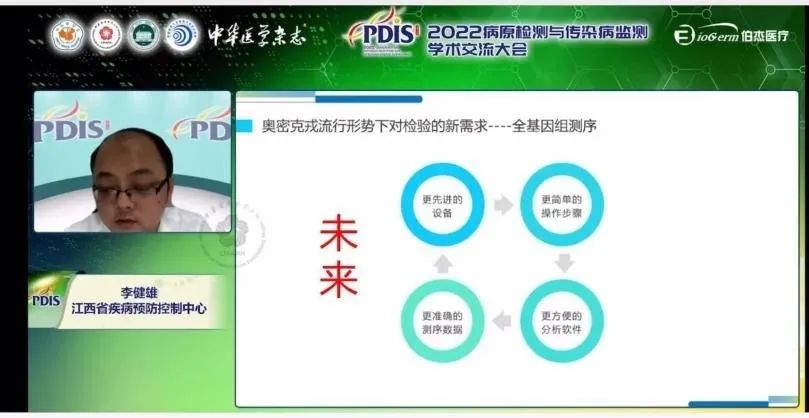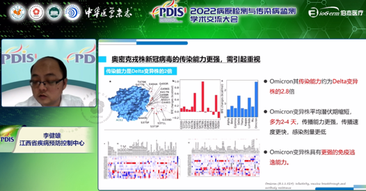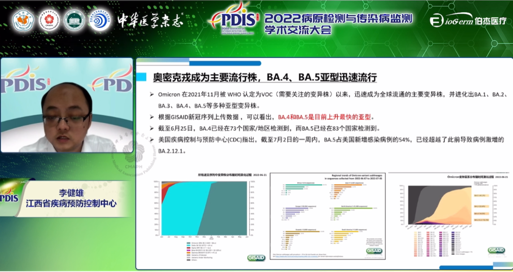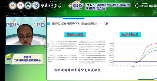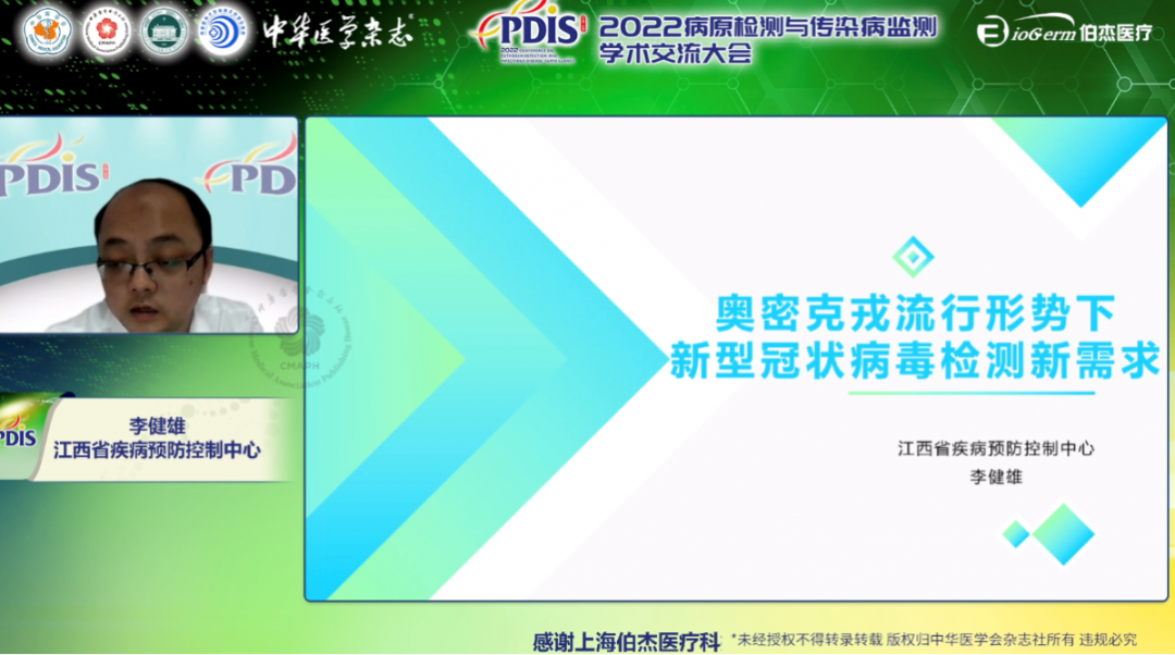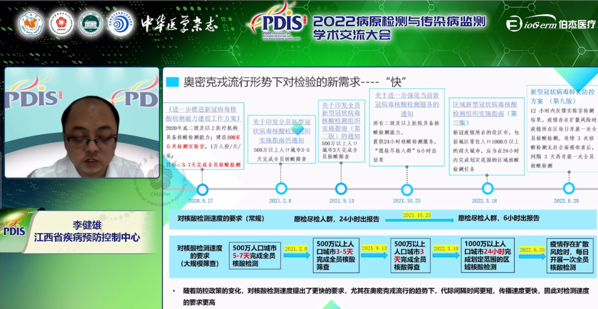 本次,伯杰醫(yī)療有幸邀請到江西省疾病預防控制中心疾病控制檢驗所副所長李健雄作為講者,在監(jiān)測干預分會會議上為我們分享了《奧密克戎流行形勢下新型冠狀病毒檢測新需求》。