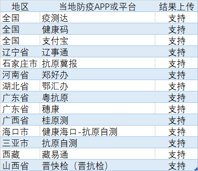 部分省市抗原結果上傳平臺舉例,伯杰抗原結果支持且不局限以下平臺: