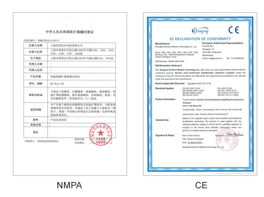 BG-Nova-X8設(shè)備及配套試劑目前已經(jīng)獲得中國(guó)NMPA三類注冊(cè)證,CE認(rèn)證,新冠核酸最低檢出限達(dá)200copies/mL,準(zhǔn)確度超過(guò)99%。