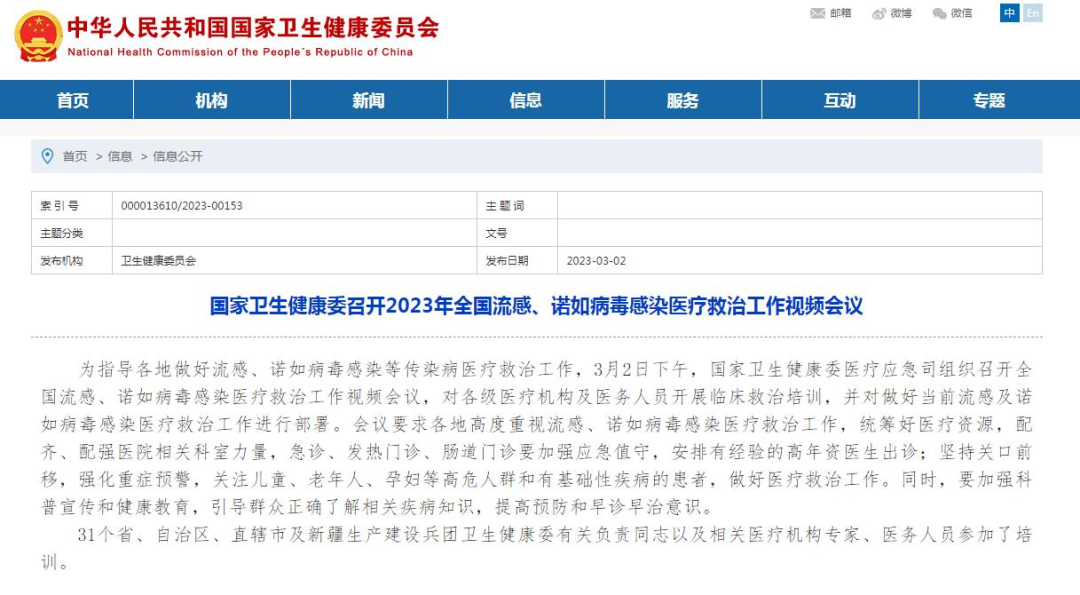 3月2日下午,國家衛(wèi)生健康委醫(yī)療應(yīng)急司組織召開全國流感、諾如病毒感染醫(yī)療救治工作視頻會議,對做好當(dāng)前流感及諾如病毒感染醫(yī)療救治工作進(jìn)行部署。