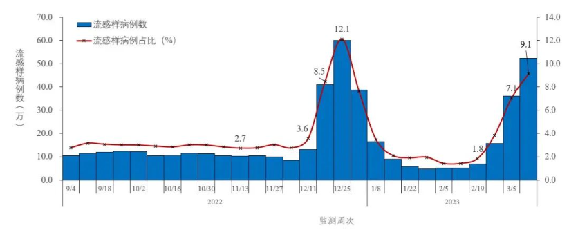 3月16日中國國家流感中心公布的國家第十周(3月6日~3月12日)流感監(jiān)測周報,第十周我國流感病毒陽性率比第九周上升11.7%,流感病例暴發(fā)疫情較第九周增加87起。