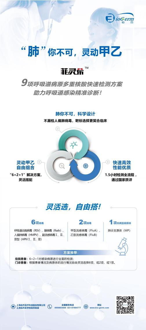 六項呼吸道病毒核酸檢測試劑采用通用熒光PCR技術(shù),對常見的:呼吸道合胞病毒、腺病毒、人偏肺病毒、副流感病毒1型、副流感病毒2型、副流感病毒3型六種呼吸道病毒進行檢測;具有科學(xué)的“「肺」你 不可,靈動「甲乙」”的產(chǎn)品創(chuàng)新設(shè)計理念:項目覆蓋全,不漏檢人偏肺病毒,靶標(biāo)選擇更契合臨床;6項可搭配甲型/乙型流感病毒2項及肺炎支原體檢測1項,形成“6+2+1”呼吸系列解決方案,靈活搭配既能滿足臨床在流感季的需求,又能和呼吸道六聯(lián)形成產(chǎn)品組合,可針對不同的流行季節(jié)和患者情況靈活選擇。1.5小時檢測全流程,快速報告結(jié)果,契合臨床快速診斷需求,產(chǎn)品性能優(yōu)異,通過國家質(zhì)評。