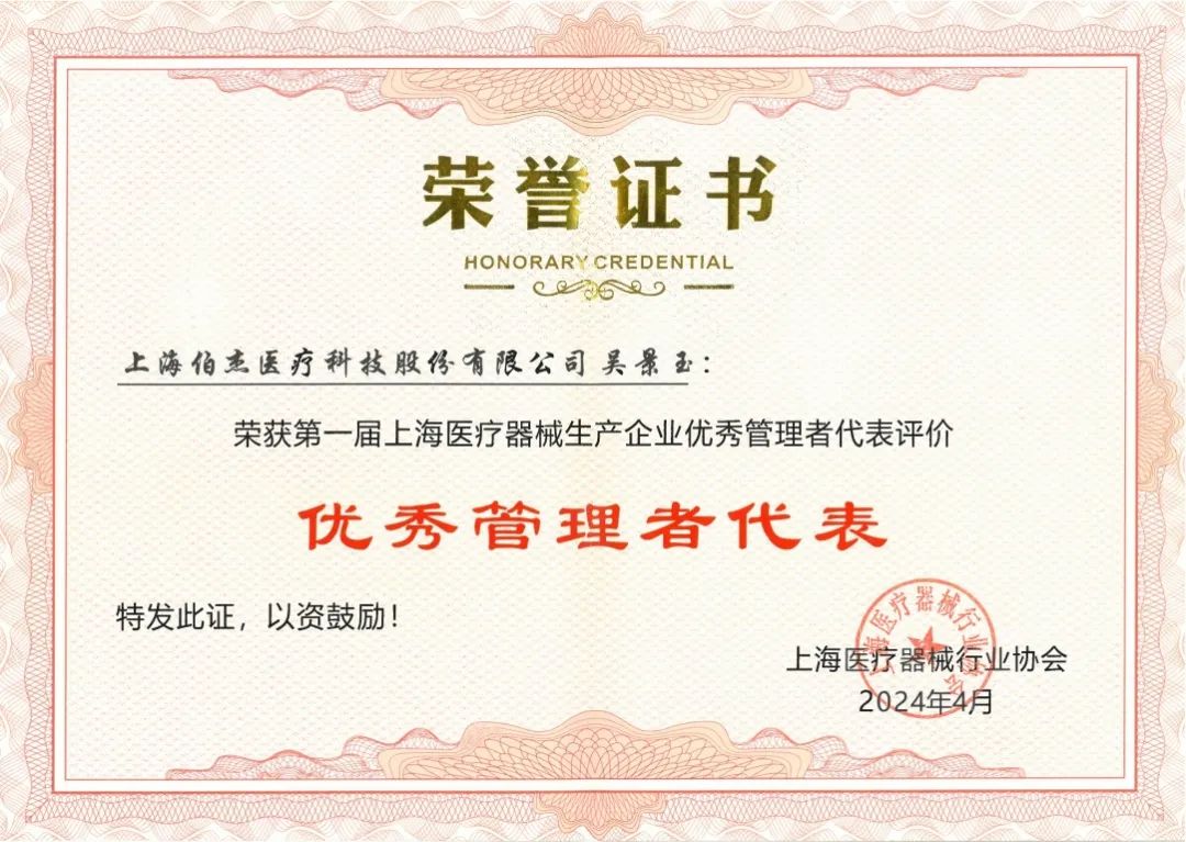 第一屆上海市醫(yī)療器械生產(chǎn)企業(yè)優(yōu)秀管理者榮譽(yù)不僅是對吳景玉本人在生產(chǎn)質(zhì)量管理的認(rèn)可,也是相關(guān)主管部門對伯杰醫(yī)療的肯定。通過此次評價(jià)工作,進(jìn)一步強(qiáng)化了企業(yè)的質(zhì)量安全主體責(zé)任意識,提升醫(yī)療器械生產(chǎn)企業(yè)管理者代表的社會影響力,有利于充分發(fā)揮高素質(zhì)人才的引領(lǐng)示范作用,促進(jìn)醫(yī)療器械產(chǎn)業(yè)的高質(zhì)量發(fā)展。