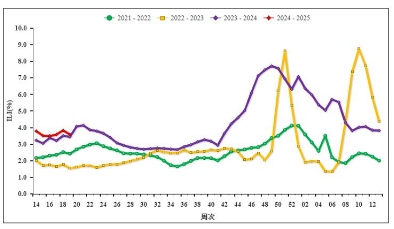 2024年第19周,北方省份哨點醫(yī)院報告的 ILI%為3.6%,低于前一周水平(3.8%),高于2021~2023年同期水平(2.4%、1.6%和 3.4%)。