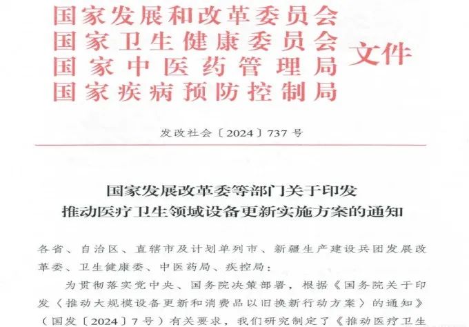 為貫徹落實(shí)黨中央、國(guó)務(wù)院決策部署,根據(jù)《國(guó)務(wù)院關(guān)于印發(fā)〈推動(dòng)大規(guī)模設(shè)備更新和消費(fèi)品以舊換新行動(dòng)方案〉的通知》(國(guó)發(fā)【2024】7號(hào))有關(guān)要求,國(guó)家發(fā)改委、國(guó)家衛(wèi)健委、國(guó)家中醫(yī)藥管理局、國(guó)家疾控局四部委聯(lián)合研究制定了關(guān)于《推動(dòng)醫(yī)療衛(wèi)生領(lǐng)域設(shè)備更新實(shí)施方案的通知》。