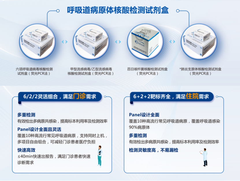 十項(xiàng)方案其產(chǎn)品清單包括:伯杰醫(yī)療呼吸道六項(xiàng)病毒、甲乙流、肺炎支原體以及百日咳核酸檢測(cè)試劑一共4款注冊(cè)產(chǎn)品。針對(duì)住院患者鑒別診斷的需求,推薦6+2+2方案,針對(duì)門診患者小panel靈活組合的需求推薦6/2/2靈活選擇方案。該方案可實(shí)現(xiàn)最快40分鐘出結(jié)果。