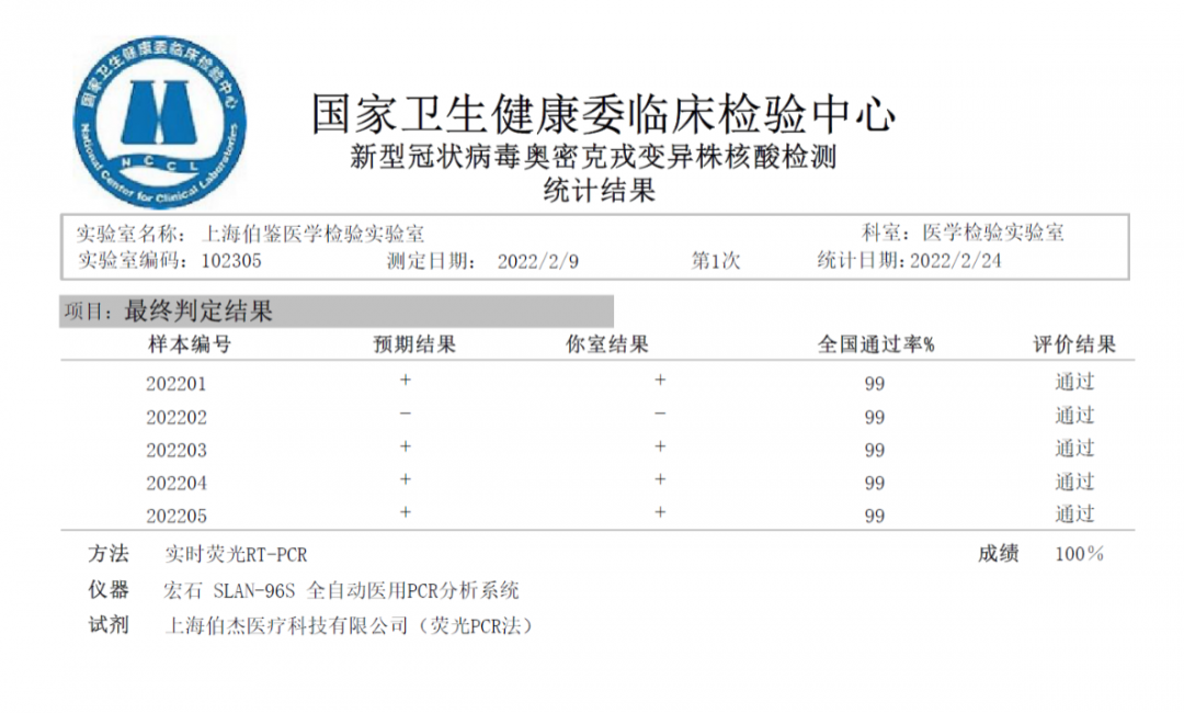本次室間質(zhì)量評價(jià)中,伯杰醫(yī)療的全資子公司伯鑒醫(yī)學(xué)檢驗(yàn)實(shí)驗(yàn)室積極參加,并以滿分成績通過考核。