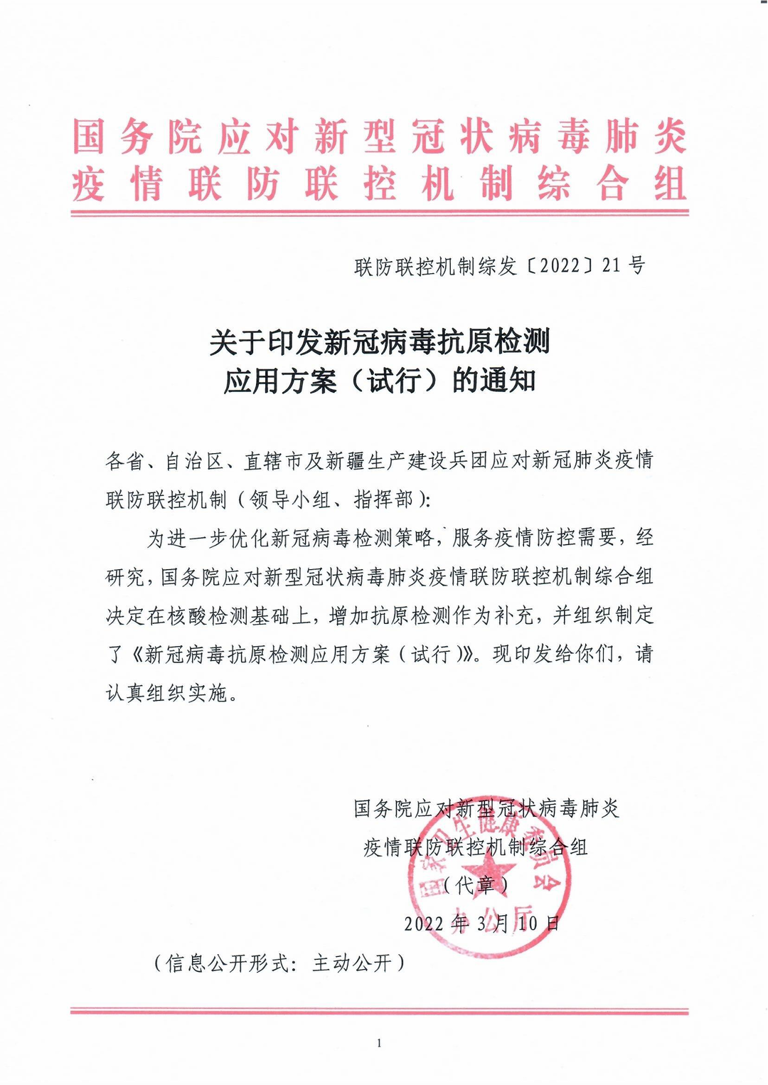 3月10日,國務(wù)院應(yīng)對新冠病毒肺炎疫情聯(lián)防聯(lián)控機(jī)制綜合組發(fā)布《關(guān)于印發(fā)新冠病毒抗原檢測應(yīng)用方案(試行)的通知》(以下簡稱“通知”)。