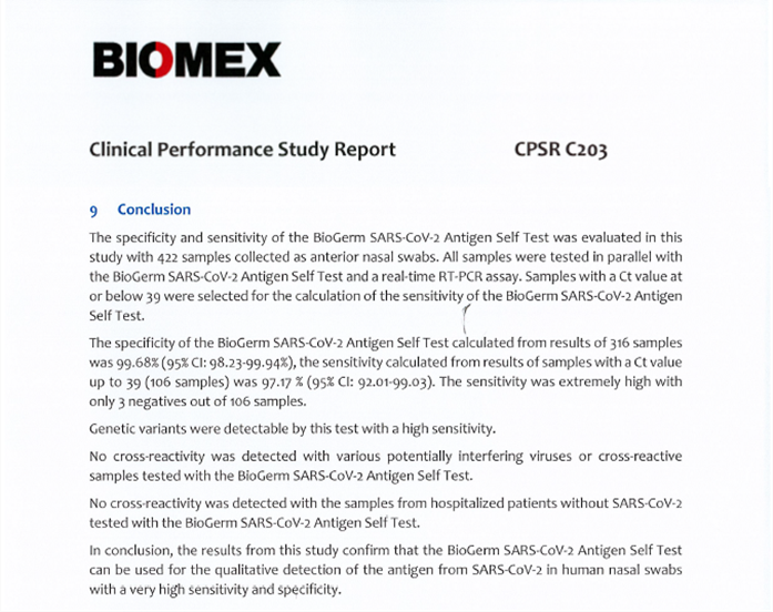 在德國BIOMEX醫(yī)學(xué)實(shí)驗(yàn)室出具的檢測報(bào)告中,伯杰醫(yī)療所研發(fā)的新型冠狀病毒2019-nCoV抗原檢測試劑盒以靈敏度97.17%、特異性99.68%受到了極高的肯定與推薦。