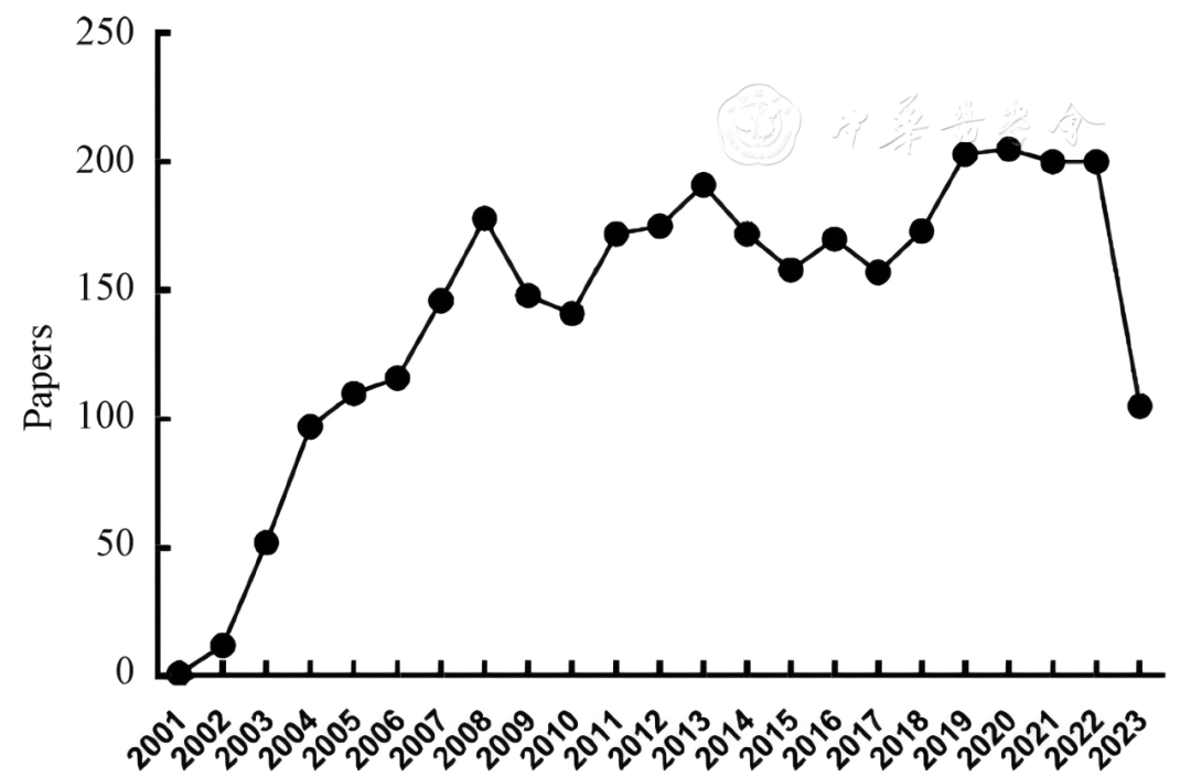 圖1:2001—2023 年 HMPV 研究論文的逐年分布情況