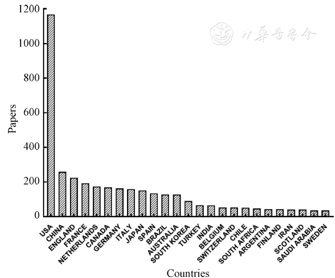 3282篇文章中,發(fā)表文章最多的是美國,共1168篇,中國排名第二,共發(fā)表259篇。