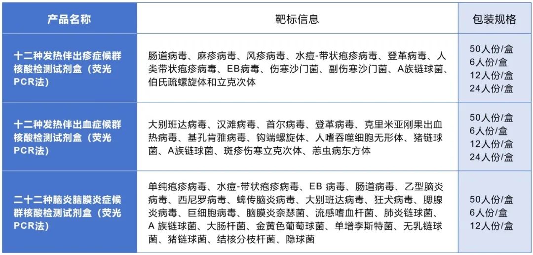 青島伯杰針對(duì)發(fā)熱伴出疹癥候群、發(fā)熱伴出血癥候群、腦炎腦膜炎癥候群病原體設(shè)計(jì)特異性引物探針,通過(guò)熒光PCR檢測(cè)儀,實(shí)現(xiàn)對(duì)發(fā)熱伴癥候群系列的定性檢測(cè)。試劑盒采用特色A+B預(yù)制分裝包裝,操作便捷,快速出結(jié)果,助力疾病預(yù)防控制中心對(duì)發(fā)熱伴癥候群的精準(zhǔn)鑒別和監(jiān)測(cè)。