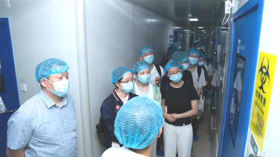 在萬(wàn)級(jí)潔凈實(shí)驗(yàn)室走廊的觀察窗前,實(shí)驗(yàn)室技術(shù)人員講解了實(shí)驗(yàn)室運(yùn)作體系: