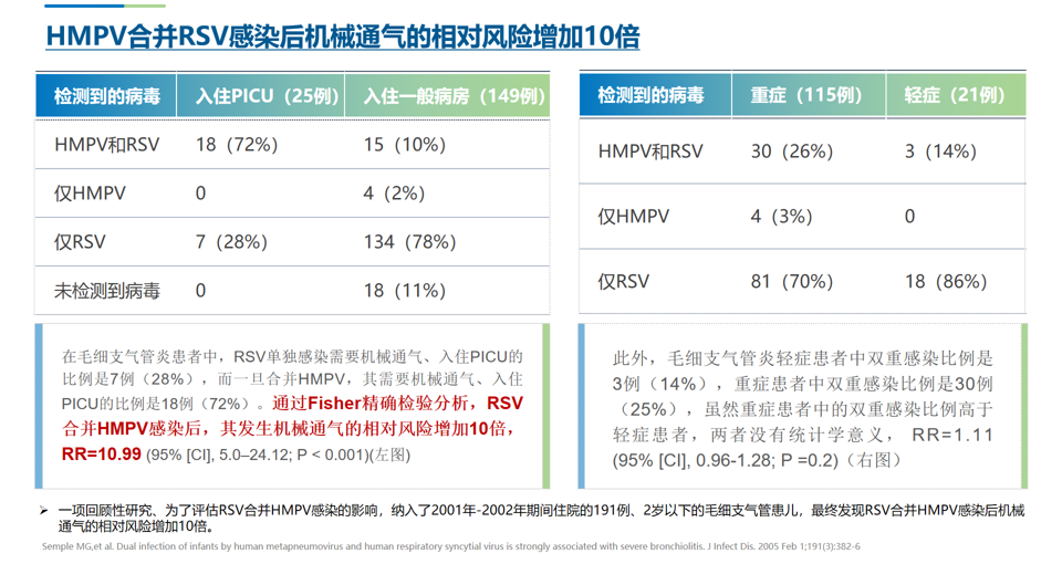 一項納入191例2歲以下住院患者的研究顯示:hMPV與RSV合并感染后,機械通氣的相對風險增加10倍[2]。