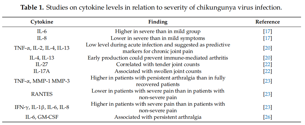 在CHIK發(fā)病過程中,細胞因子的釋放遵循特定時間模式,與疾病進程和免疫應(yīng)答階段緊密關(guān)聯(lián):超早期(一般3天內(nèi))IFN-α/β迅速升高,隨后CXCL10/IP-10、MCP-1在24-48小時內(nèi)顯著上升,招募免疫細胞;在急性高峰期(3-7天),IL-6、TNF-α、IL-1β、IL-12、IFN-γ等Th1型細胞因子達到峰值;進入緩解期(7-14天)多數(shù)促炎因子(如IL-6、TNF-α)開始下降,而抗炎因子如IL-10水平上調(diào),反饋性抑制過度炎癥,同時部分Th2型因子(如IL-4、IL-13)可能出現(xiàn)遲發(fā)性升高;在疾病慢性期(>30天)細胞因子可呈現(xiàn)慢性關(guān)節(jié)炎特征譜系,特別在持續(xù)性關(guān)節(jié)痛患者中,TNF-α、IL-6、IL-1β持續(xù)高于基線,提示炎癥未完全消退,滑膜組織處于持續(xù)低度活化狀態(tài)。