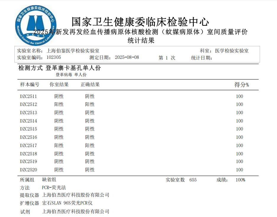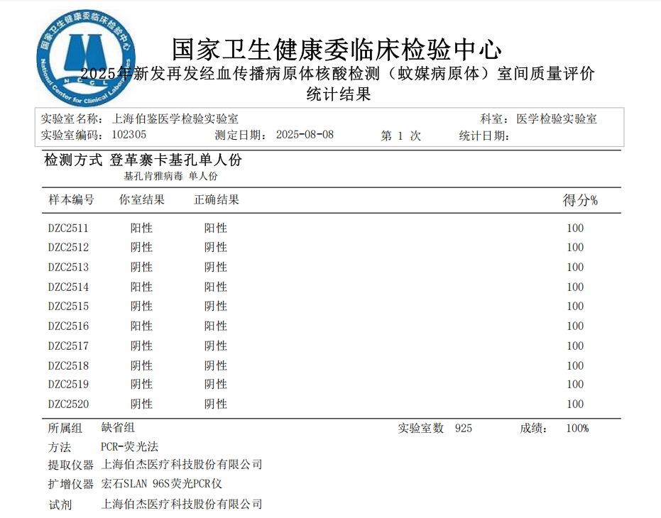 近日,國家衛(wèi)生健康委臨床檢驗中心(NCCL)正式公布“2025年度全國基孔肯雅病毒核酸檢測室間質(zhì)量評價預研活動”和“2025年新發(fā)再發(fā)經(jīng)血傳播病原體核酸檢測(蚊媒病原體)室間質(zhì)量評價”結(jié)果,上海伯鑒醫(yī)學檢驗實驗室憑借嚴謹?shù)馁|(zhì)量管理體系和精準的檢測能力,以優(yōu)異成績通過本次評估,充分彰顯了其在感染性疾病分子診斷領(lǐng)域的專業(yè)實力。