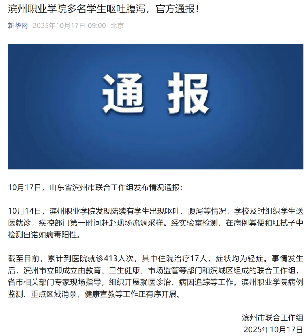 據(jù)新華網(wǎng)報(bào)道,10月14日,濱州職業(yè)學(xué)院發(fā)現(xiàn)陸續(xù)有學(xué)生出現(xiàn)嘔吐、腹瀉等情況,學(xué)校及時(shí)組織學(xué)生送醫(yī)就診,疾控部門第一時(shí)間趕赴現(xiàn)場流調(diào)采樣。經(jīng)實(shí)驗(yàn)室檢測,在病例糞便和肛拭子中檢測出諾如病毒陽性。