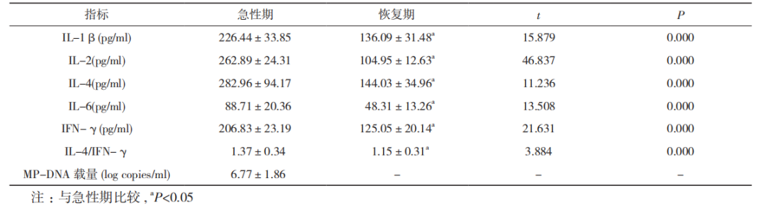 SMPP組患兒急性期與恢復(fù)期炎癥細(xì)胞因子水平比較,SMPP組患兒恢復(fù)期 IL-1β、IL-2、IL-4、IL-6、IFN-γ 和 IL-4/IFN-γ 均明顯低于急性期, 差異具有統(tǒng)計(jì)學(xué)意義 (P<0.05)。(表2)這表明細(xì)胞因子表達(dá)情況與病情轉(zhuǎn)歸等均有一定關(guān)系 , 因此細(xì)胞因子檢測可為臨床評估病情和治療干預(yù)提供了一定的理論依據(jù)。