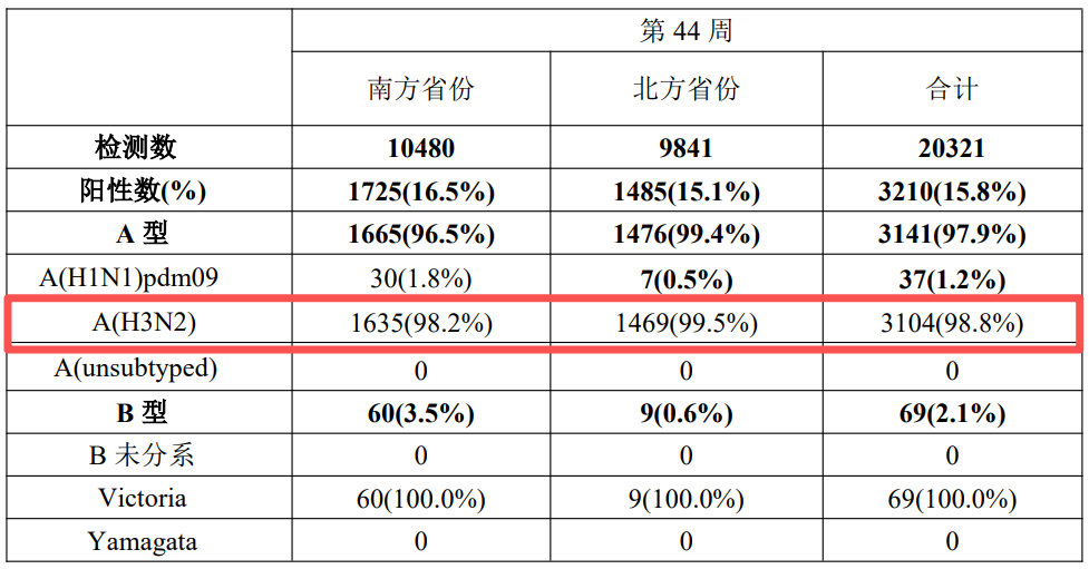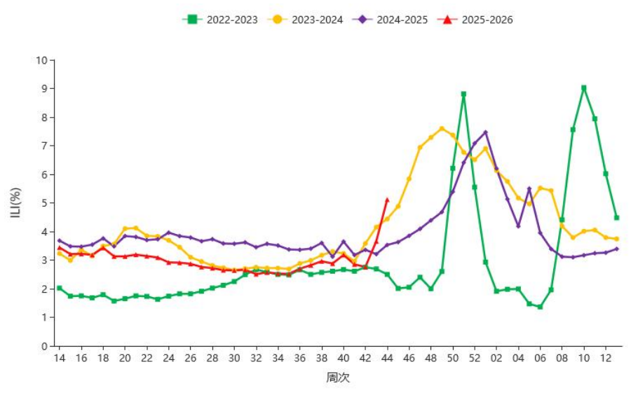 2025年第44周,全國(guó)(未含港澳臺(tái)地區(qū),下同)流感監(jiān)測(cè)網(wǎng)絡(luò)實(shí)驗(yàn)室共檢測(cè)流感樣病例監(jiān)測(cè)標(biāo)本20321份?北方省份哨點(diǎn)醫(yī)院報(bào)告的流感樣病例( Influenza-like illness, ILI)為 5.1%,較上周升高3.7%,高于2022年,2023年和2024 年同期水平(2.5%,4.4%和 3.5%)。檢測(cè)到流感病毒陽(yáng)性標(biāo)本1485份,其中7份A(H1N1)pdm09,1469份為A(H3N2)占比99.5%,南方省份哨點(diǎn)醫(yī)院報(bào)告的ILI%為4.6%,高于前一周水平(4.1%),高于 2022 年和 2024 年同期水平(3.1%和 3.3%),其中A(H3N2)占比98.2%,全國(guó)H3N2占比為98.8%[2]?