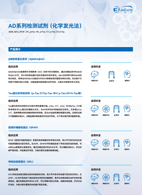 上海伯杰醫(yī)療科技股份有限公司針對中國老年癡呆發(fā)病持續(xù)增長,病人和家屬迫切需要有效早期檢測手段,依托高靈敏度化學(xué)發(fā)光技術(shù),自主開發(fā)AD系列檢測試劑,實(shí)現(xiàn)“一滴血”檢測AD特異性生物標(biāo)志物,包括Aβ42/40,pTau217,pTau181,GFAP,NfL等指標(biāo),可幫助臨床醫(yī)生基于”A+T+N”診斷框架進(jìn)行疾病診斷,對病患進(jìn)行早期篩查,病癥分型,干預(yù)效果監(jiān)測等不同臨床用途需要。