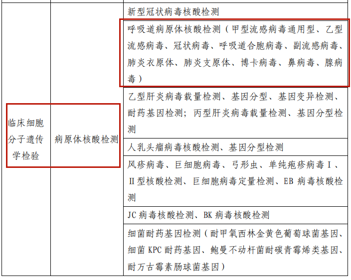 該標(biāo)準(zhǔn)強(qiáng)調(diào)在臨床細(xì)胞分子遺傳學(xué)方向:國(guó)家檢驗(yàn)醫(yī)學(xué)中心需要開展甲型流感病毒通用型、乙型流感病毒、冠狀病毒、呼吸道合胞病毒、副流感病毒、肺炎衣原體、肺炎支原體、博卡病毒、鼻病毒、腺病毒呼吸道病原體核酸檢測(cè)項(xiàng)目。開展檢驗(yàn)項(xiàng)目覆蓋必備檢驗(yàn)項(xiàng)目清單。