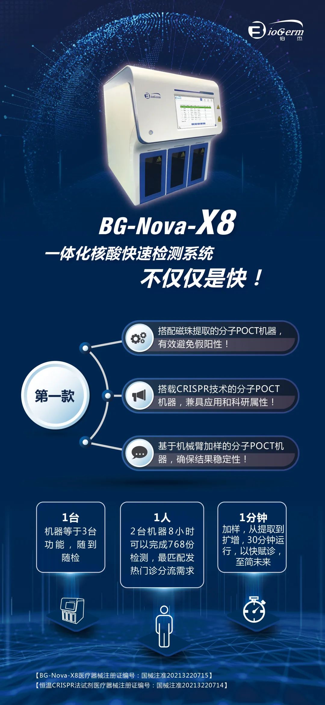 由伯杰醫(yī)療自主研發(fā)的“BG-Nova-X8一體化核酸快速檢測(cè)系統(tǒng)”(注冊(cè)證編號(hào):國(guó)械注準(zhǔn)20213220715)定位為POCT應(yīng)用場(chǎng)景,又集成CRISPR技術(shù)、磁珠提取、高精度機(jī)械臂等先進(jìn)技術(shù)的設(shè)備,在當(dāng)前政策要求下,更能解決客戶的檢測(cè)效率痛點(diǎn)問(wèn)題。