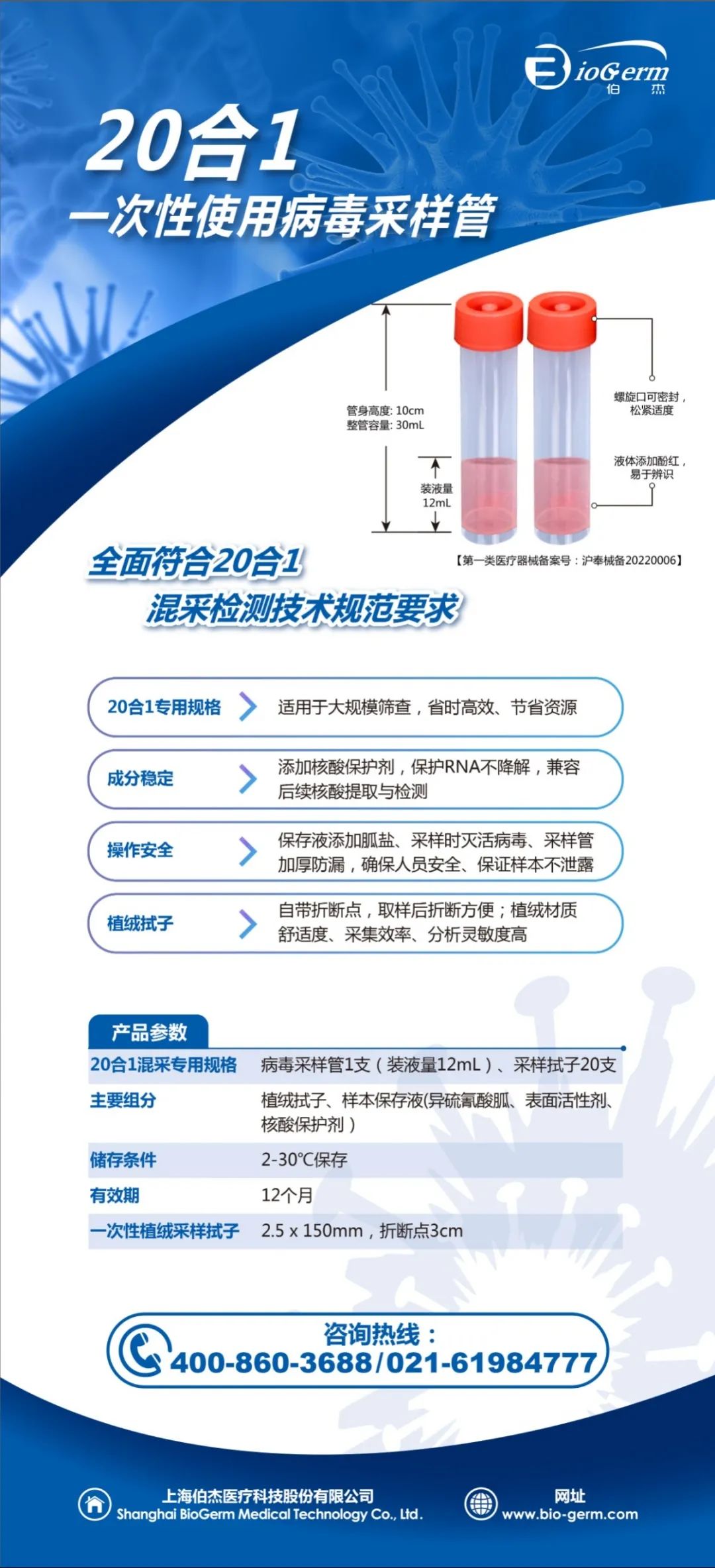 1.集中隔離點(diǎn)及其他重點(diǎn)人群實(shí)行單采單檢2.封控區(qū)人群實(shí)行單采單檢或1戶1管4.防范區(qū)和其他區(qū)域可實(shí)行20合1混采5.單采單檢對象在多輪檢測均未檢出陽性的情況下,可視情實(shí)行10合1混采。伯杰醫(yī)療【20合1一次性使用病毒采樣管】,全面符合20合1混采檢測技術(shù)規(guī)范要求,適用于大規(guī)模篩查,省時高效,節(jié)約資源!