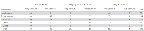 本次研究所涉及的樣本類型較為全面,包括了口咽拭子,鼻咽拭子,痰液,血液和尿液樣本,統(tǒng)一采用專業(yè)的核酸提取試劑盒在2個小時內(nèi)完成核酸提取,然后再進行RT-PCR和ddPCR檢測。