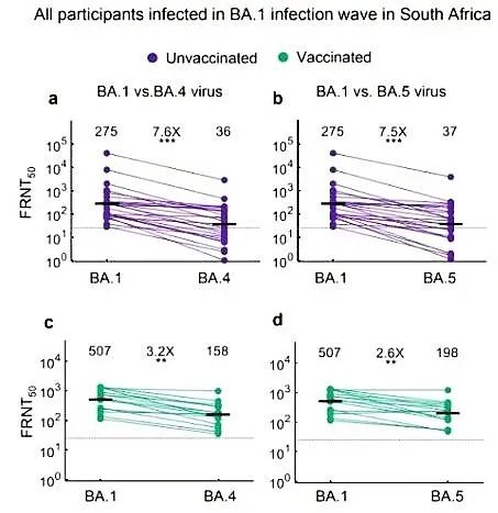 在接種疫苗的參與者中,通過BA.1感染激發(fā)的免疫力,BA.4(c)或BA.5(d)與BA.1病毒的中和率比較。